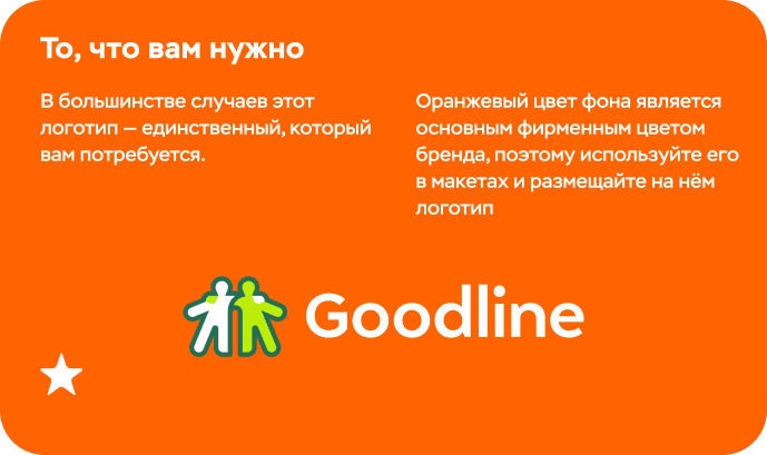 У логотипа четыре базовые составляющие: знак (графическая часть в виде двух людей), фирменные цвета и написание «Goodline» + слоган (текстовая часть). Их совместное использование обеспечивает узнаваемость и прочную визуальную связь с брендом